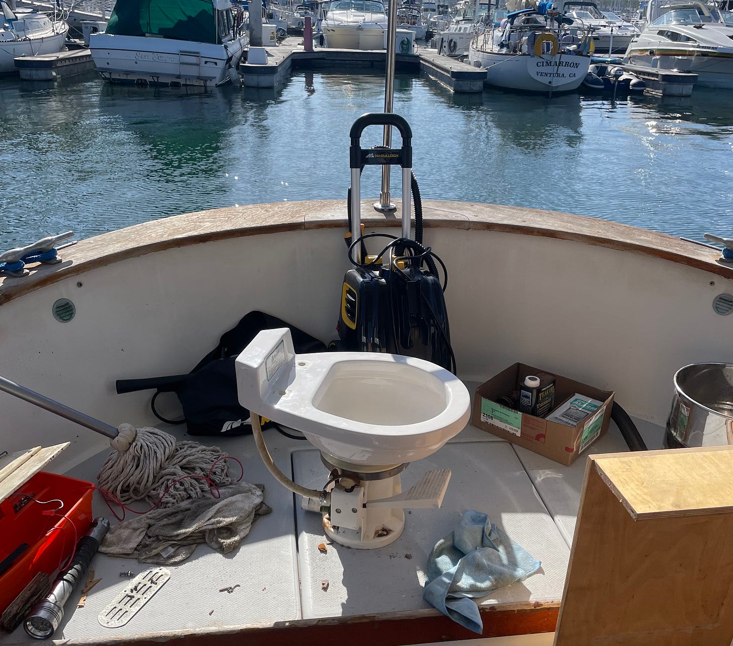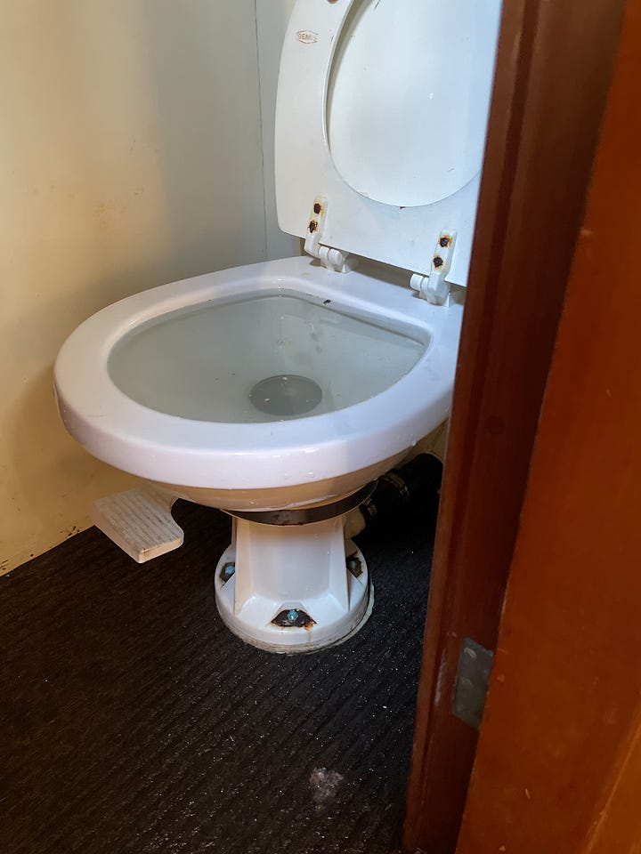 I broke the toilet. Today. I stripped it down and everything. Took my ratchet set out and straight unbolted it from the wet floor. Threw it in the back of the boat like it was in time out. Everytime I went to flush it, water spewed out the rear. Didn’t know what was back there. Couldn’t reach it. Had to get back there, Absolutely ripped the thing straight off the bolts. Disconnected water. Pulled the discharge connect off like I was mad at it. I was mad at it. Yanked that thing out the bathroom and took it out back for inspection. Vacuum breaker completely SHOT. Just gone. Gasket all deteriorated. Made me so mad just looking at it. Couldn’t even flush the damn thing in this condition. Couldn’t pull a vacuum. You know what a vacuum toilet that can’t pull a vacuum is good for? Nothing. Pissed me off.